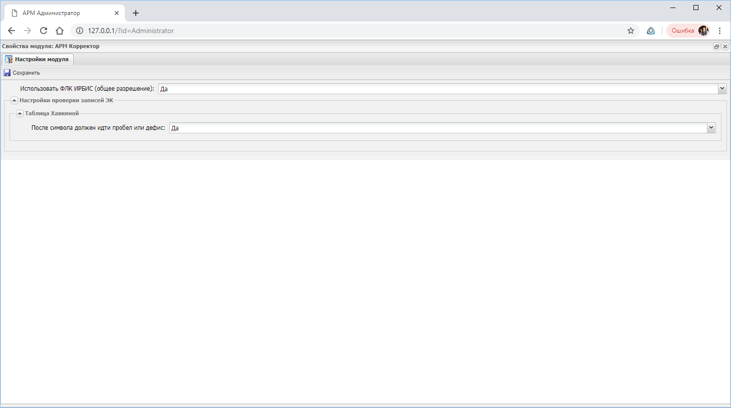 Общий вид панели настроек модуля "АРМ Корректор"